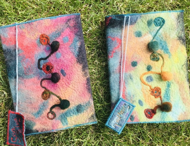 Two sea themed sketchbooks A5 hardbacks with wet felted and free stitched removable and reusable covers. Sea Slug and Seaweed each have a hand stitched bookmark and are partly nuno felted with silk. Each has a 3D aspect to the cover of hand made art yarn. £28 each incl pp UK. Please email for details