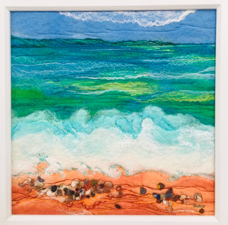 ‘Across the Bay’ – wet felted and free stitched scene of some of our most spectacular beaches in and around the Rhins of Galloway. Framed in white it is 12.5 inches square and £95 plus UK pp at £8 (overseas please request pricing) This is also available in kit form, varying colours of fibres and silks.