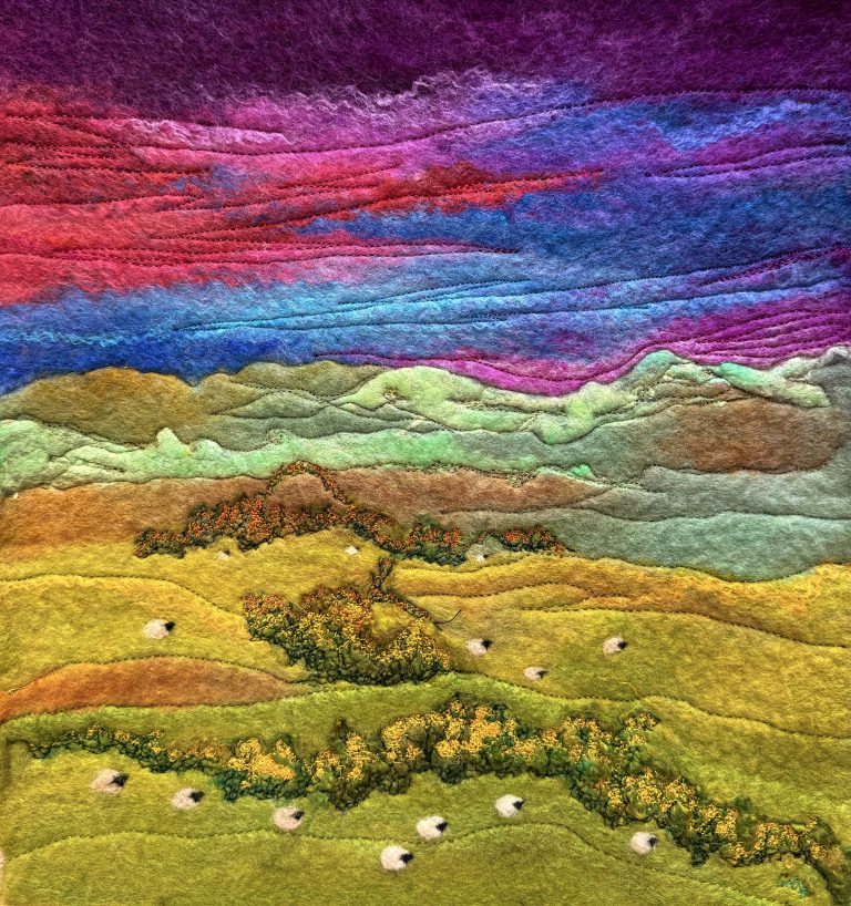 This piece is wet felted and free motion stitched with needle felted sheep, inspired by the stunning sunsets we get on the Mull of Galloway and how the land catches the light!