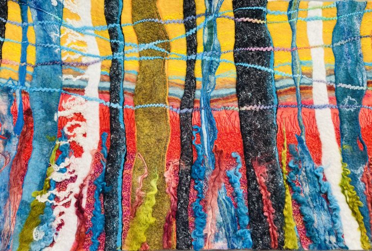 Inspired by the sunset at Glen Auchie between the trees. Wet Felted and intensively free motion stitched.